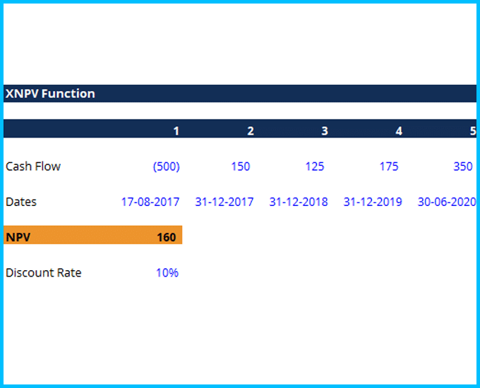 Formula: =XNPV(discount_rate, cash_flows, dates)